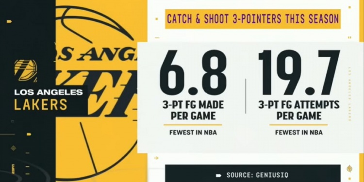 湖人本赛季场均接球就投三分出手19.7次&命中6.8记 均为联盟垫底