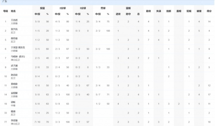 广东队方面,李奕臻18分5篮板2助攻2抢断,袁照耀17分4篮板1助攻,王浩然14分4篮板4助攻1抢断,徐昕11分5篮板1助攻3抢断2盖帽。