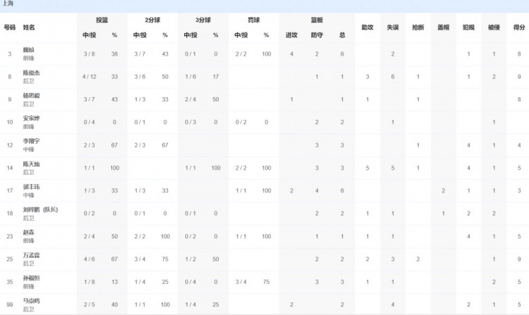 上海队方面,万孟霖9分2篮板2助攻2抢断,陈俊杰9分3篮板1助攻,魏桢8分6篮板。