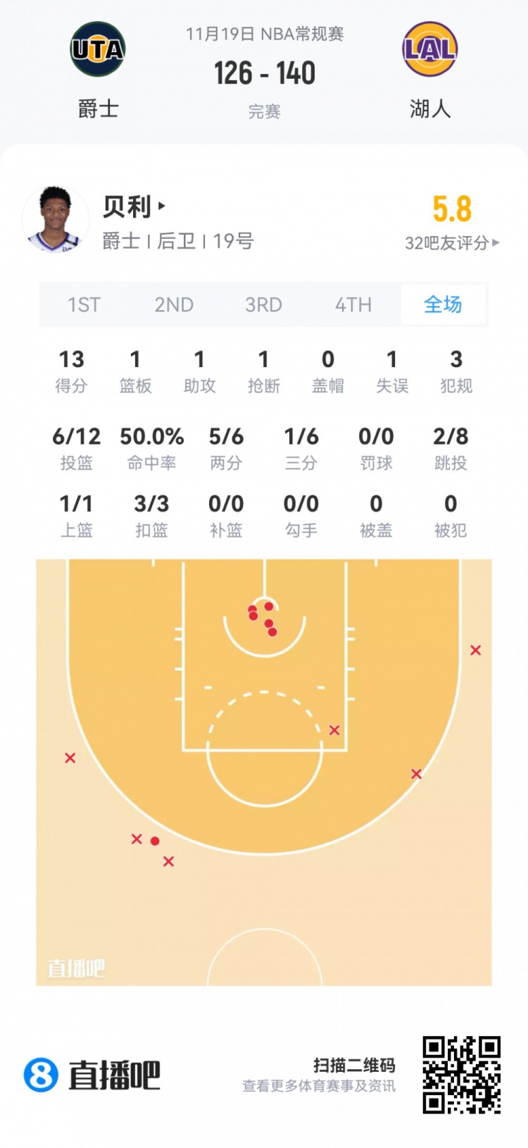 爵士首轮5号秀埃斯·贝利 登场23.4分钟